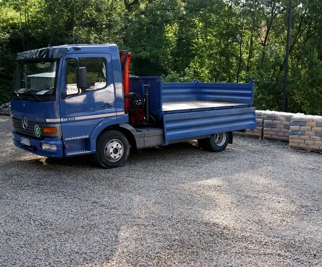 Wywrotka trzystronna Mercedes Atego o dopuszczalnej masie całkowitej 8,6 t. wyposażona w żuraw hds.